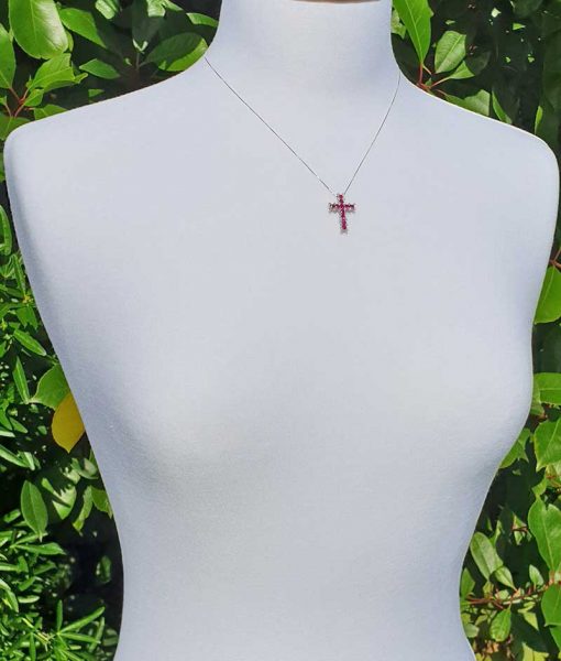 The cross features a ruby gemstones centred by a diamonds around the perimeter. All are set in solid 18ct white gold.