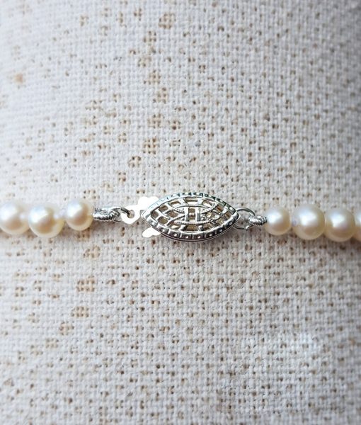 An absolutely gorgeous 17″ long necklace made from graduated white freshwater pearls and a beautiful silver filigree fishhook clasp.