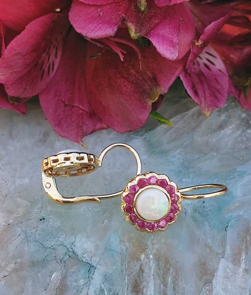 Victorian Inspired 14ct Yellow Gold Opal & Ruby Flower Drop Earrings